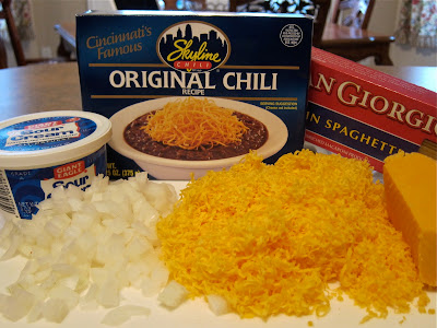 1 container of Skyline Chili, 1 package of Spaghetti, chopped onions, shredded cheese, sour cream