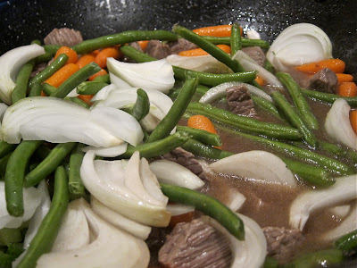 Stew beef, oil, broth, corn starch, garlic powder, paprika, onion, green beans, carrots, celery, salt, pepper, (sugar &Worcestershire)