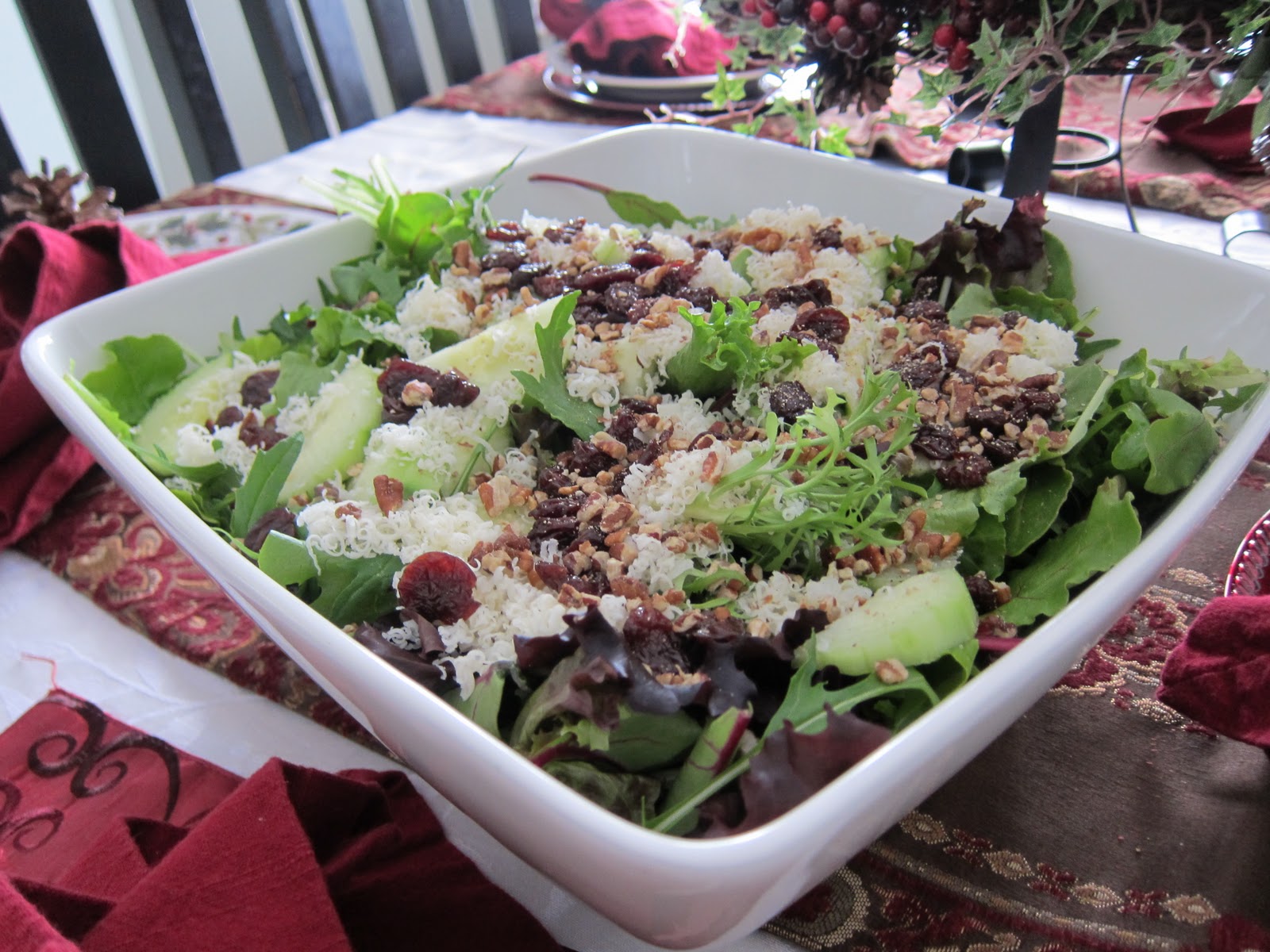 When I am entertaining for the holidays, I typically put the most effort into the main course…the salad and the dessert really need to be quick and easy so I can put the entire meal together in time. This is a salad I made over the weekend that I thought I would share…very simple, not a lot of cutting, and so yummy!  My guest even asked to take some home with her! The red and green colors make it look festive with very little effort..