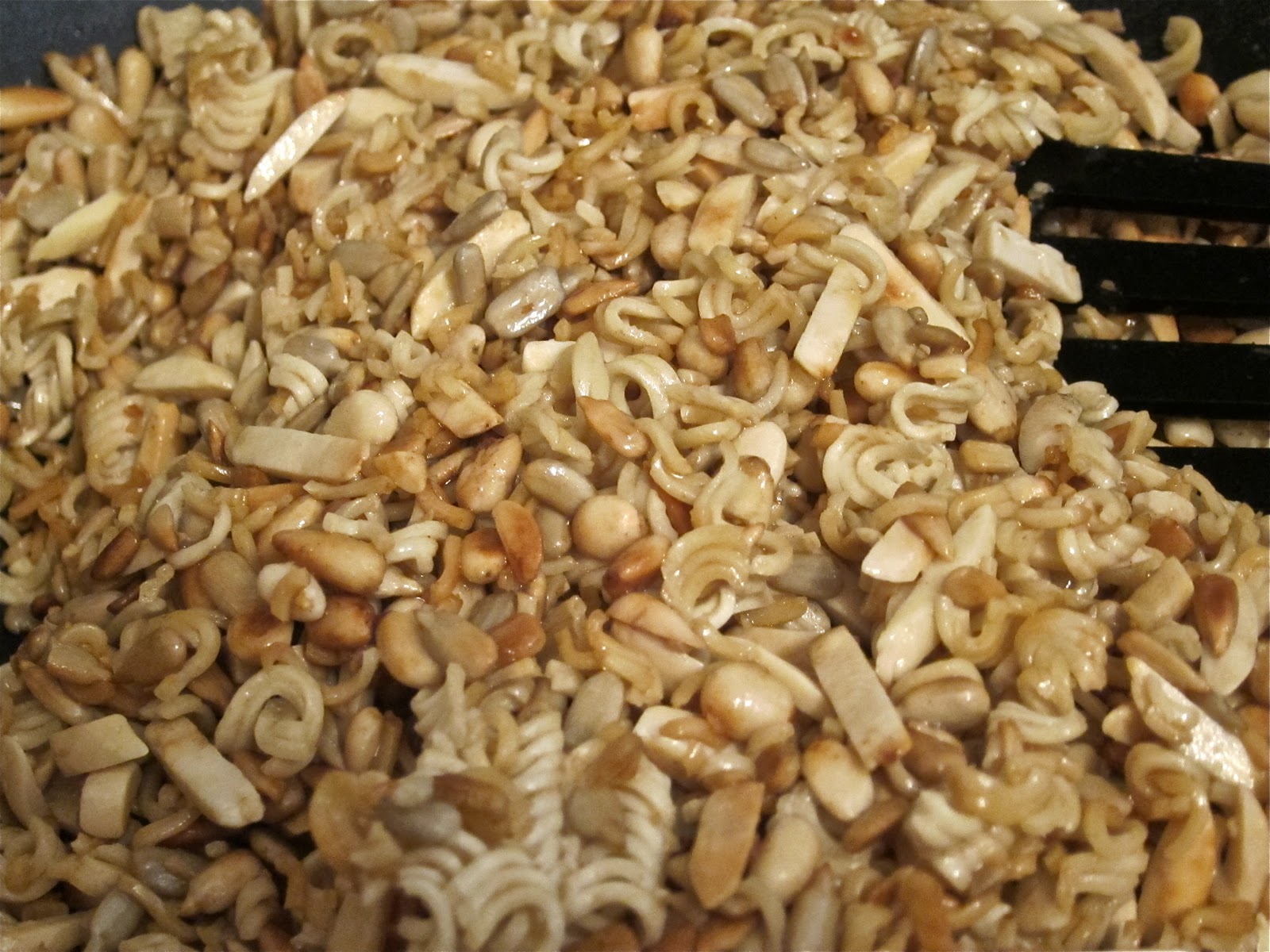 | Saute all nuts and noodles in the skillet with butter and oil |