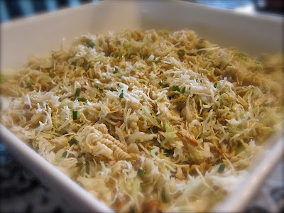 | Shredded Cabbage, slivered almonds, Ramen noodles, pine nuts, sunflower seeds, scallions |