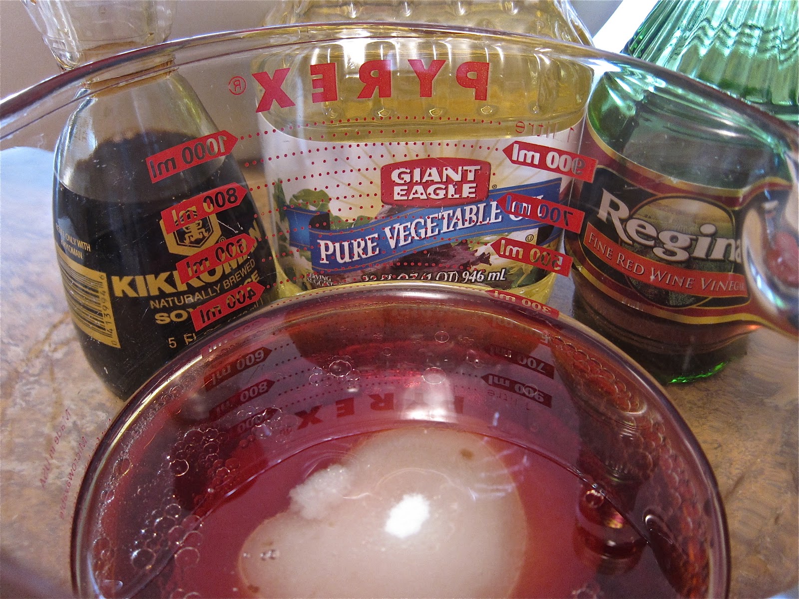 Make dressing by combining sugar, soy sauce, red wine vinegar, and oil- whisk well.