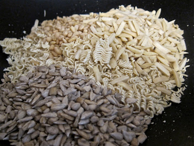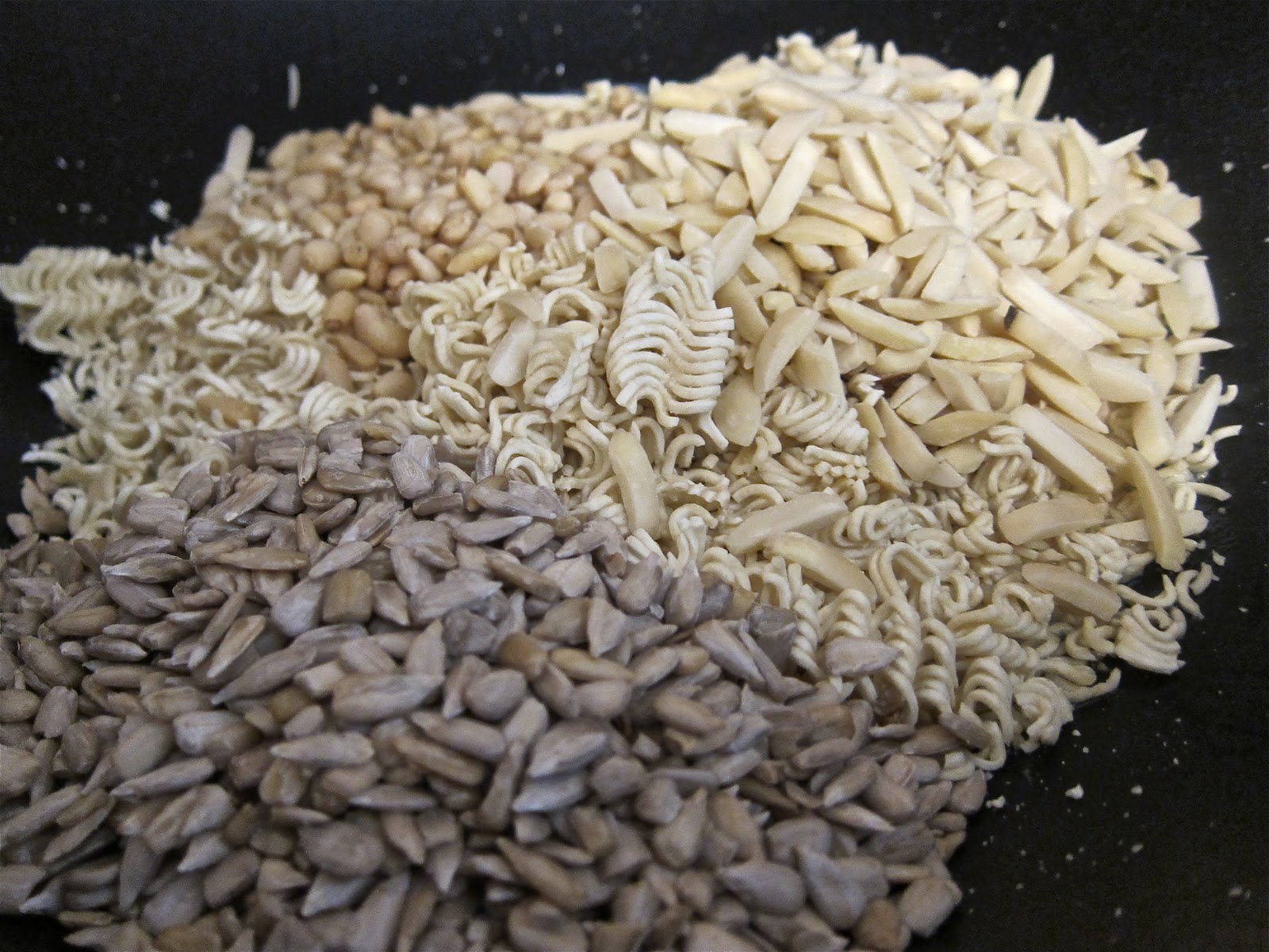 Shredded Cabbage, slivered almonds, Ramen noodles, pine nuts, sunflower seeds, scallions